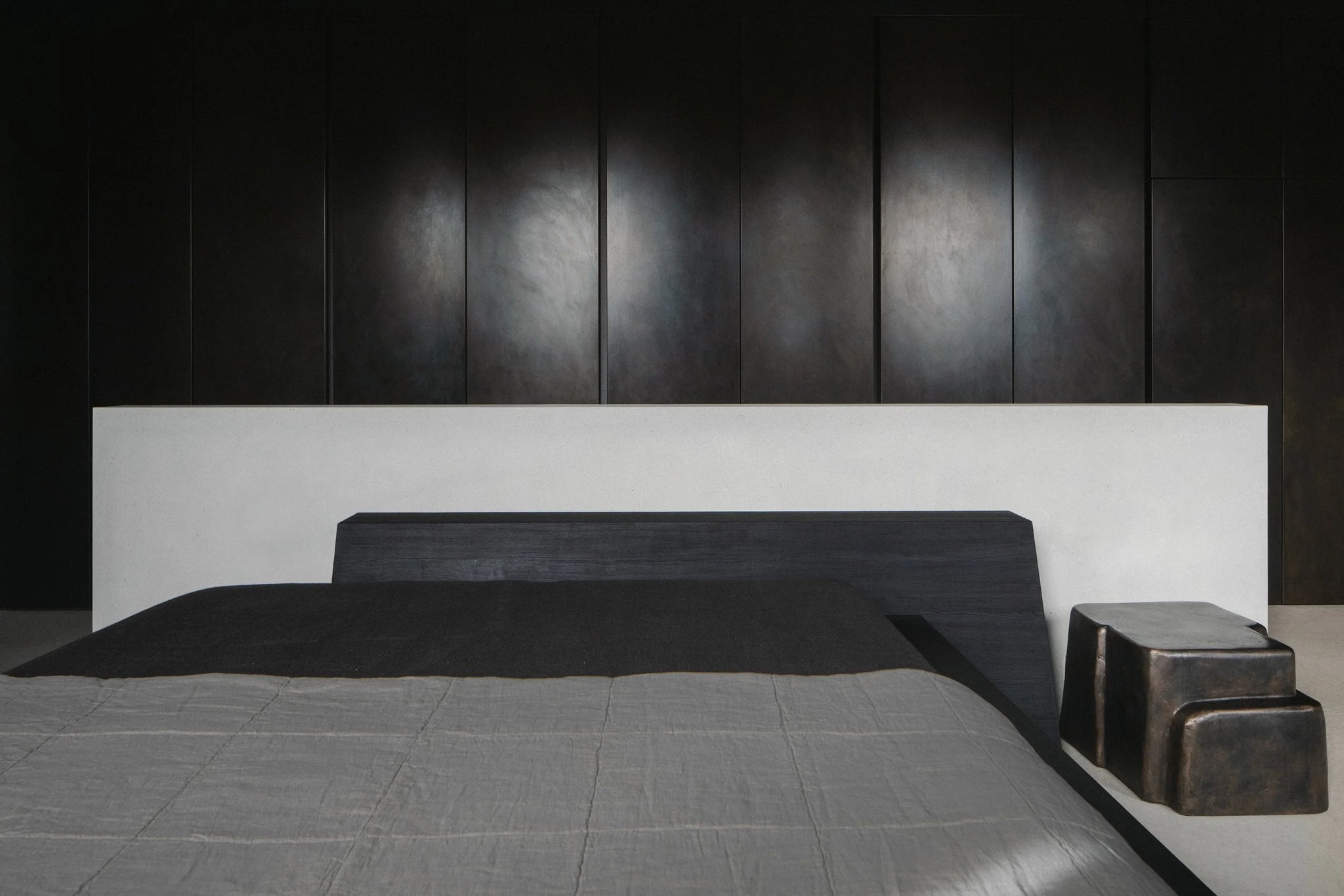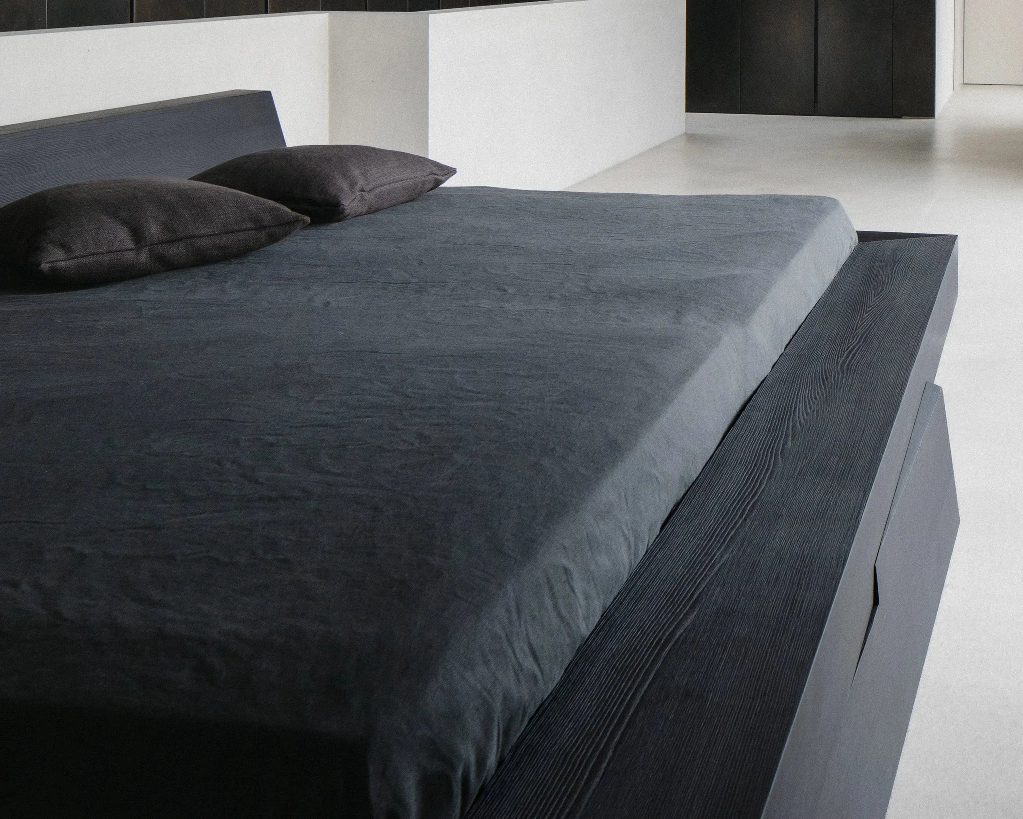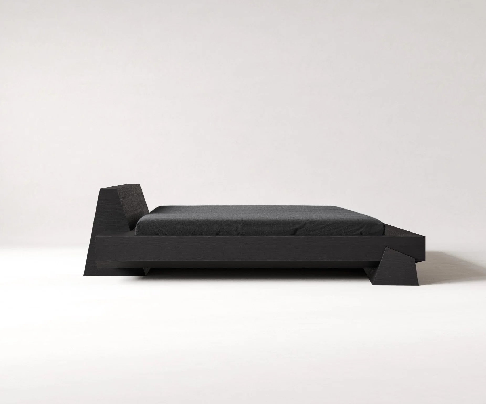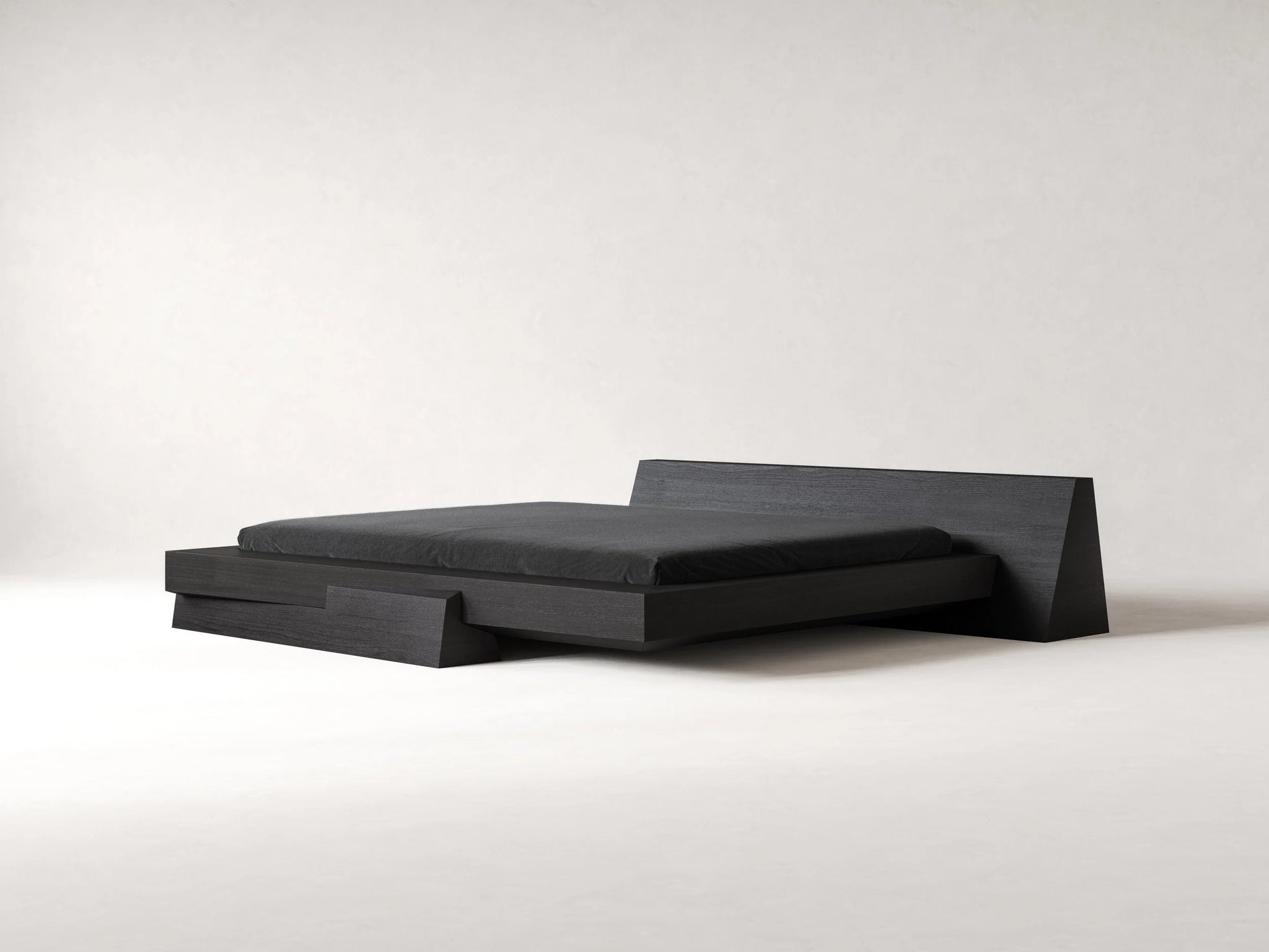 The Kalon bed, crafted from deeply charred oak, carries a quiet warmth, depth, and a distinct sense of permanence. Its deliberately pared-back form brings focus to what matters most: material honesty, refined craftsmanship, and the clarity found in stillness.